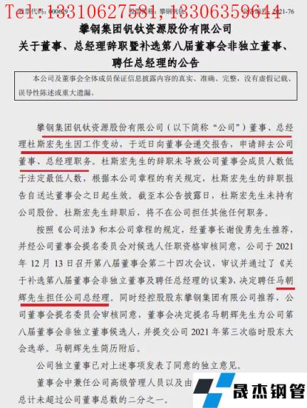 12月13日,攀鋼釩鈦董事會收到公司董事、總經(jīng)理杜斯宏因工作變動,于近日向董事會遞交報告,申請辭去公司董事、總經(jīng)理職務(wù)。杜斯宏的辭職未導(dǎo)致公司董事會成員人數(shù)低于法定最低人數(shù),根據(jù)本公司章程的有關(guān)規(guī)定,杜斯宏的辭職報告自送達董事會之日起生效。截至本公告披露日,杜斯宏未持有公司股份。杜斯宏辭職后,將不在公司擔(dān)任其他任何職務(wù)。