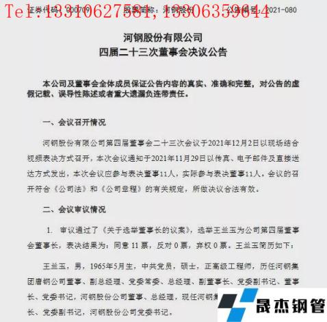 12月3日河鋼股份有限公司(以下簡稱河鋼股份)發(fā)布了第四屆二十三次董事會決議公告,據(jù)該公告顯示,河鋼股份第四屆董事會二十三次會議于2021年12月2日以現(xiàn)場結(jié)合視頻表決方式召開,會議審議并通過了《關(guān)于選舉董事長的議案》,選舉王蘭玉為公司第四屆董事會董事長。