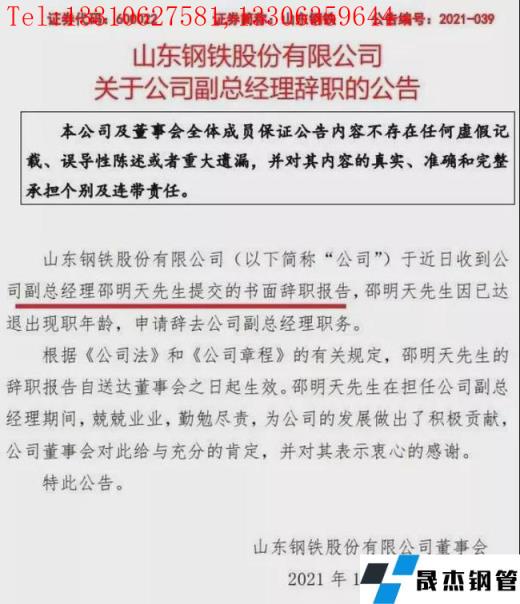 12月1日,山東鋼鐵發(fā)布公告稱,于近日收到公司副總經(jīng)理邵明天先生提交的書面辭職報告。邵明天先生因已達退出現(xiàn)職年齡,申請辭去公司副總經(jīng)理職務(wù)。