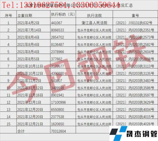 免責聲明:本網站(山東聊城晟杰無縫鋼管廠m.vsocial.cn)刊載的“超7000萬!包鋼股份年內15次被法院執行!”等均源于網絡,版權歸原作者所有,且僅代表原作者觀點,本文所載信息僅供參考。轉載僅為學習與交流之目的,如無意中侵犯您的合法權益,請及時聯系刪除。本網站刊登此篇文章并不意味著本站贊同其觀點或證實其內容的真實性,我們不對其科學性、嚴肅性等作任何形式的保證。如果侵犯了您的版權,請盡快聯系我們予以撤銷,謝謝合作!