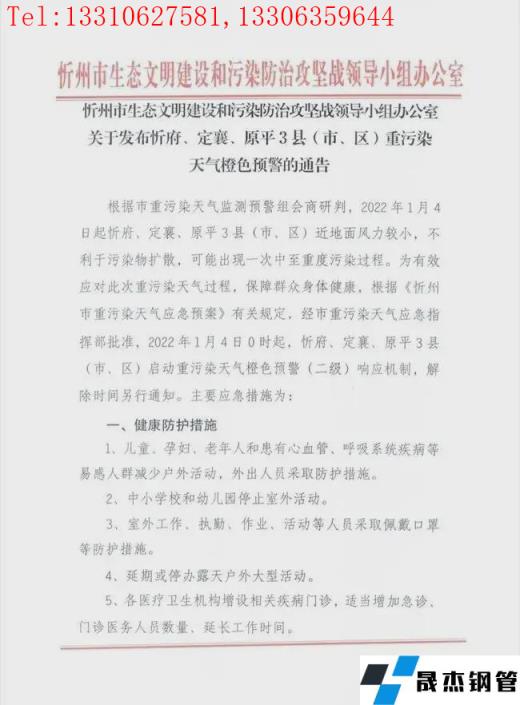 根據忻州市重污染天氣監測預警組會商研判,2022年1月4日0時起 ,忻府、定襄、原平3縣(市、區)啟動重污染天氣橙色預警(二級)響應機制,解除時間另行通知。相關強制性污染減排措施為: