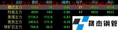 今日螺紋主力期貨跌39,收?qǐng)?bào)4753,跌幅0.81%;熱卷主力跌103,收?qǐng)?bào)4932,跌幅2.05%;焦煤主力跌172,收?qǐng)?bào)2776.5,跌幅5.83%;焦炭主力跌171,收?qǐng)?bào)3424.5,跌幅4.76%;鐵礦石主力跌36.5,收?qǐng)?bào)756,跌幅4.61%。