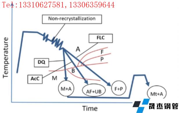 自1980年世界上第一臺在線加速冷卻裝置應用于大工業生產的鋼板軋機以來,[1]熱機控軋控冷技術經歷了三代創新;快速層流冷卻(FLC),加速冷卻(AcC)和直接淬火(DQ)與在線回火,[2]如圖1所示。控制軋制技術主要通過細化鐵素體晶粒組織來提高韌性,[3]然而,TMCP通過奧氏體轉變為針狀鐵素體和貝氏體轉變而獲得帶鋼的高強度,并增強了韌性。