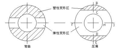 橫向壓扁及通過疊加橢圓壓扁變形來達到矯直的目的。在矯直截面中產生如圖8-9中BCDE的塑性區。這對矯直效果是非常重要的,因為彎曲矯直不能使截面全部為塑性區,利用壓扁變形來補償。另外,對局部彎曲、管端彎曲、縱向彎曲矯直效果很差,必須是縱向彎曲和壓扁的共同作用才能達到滿意的矯直效果。(注:提高厚壁鋼管壁厚精度可提高厚壁鋼管的抗壓