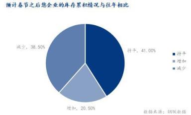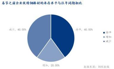 根據調研,春節之前企業優特鋼棒材的庫存水平與往年同期相比近40%同比持平,40%無縫鋼管廠庫存同比下降,僅少數庫存有增加。預計春節后庫存累計情況與往年相比,四成為持平,四成為減少,兩成為增加。主要原因是目前來看,庫存的減少,導致資源的緊缺,貿易商會向廠家拿貨,無縫鋼管廠降庫會加快。
