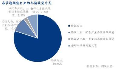 春節期間,超80%的企業冬儲放貨方式以協議為主,少量協議與冬儲政策相結合。今年市場對冬儲的熱情并不高漲。主要原因是貿易商認為價格虛高,對后市的看法不明朗,選擇以協議為主。