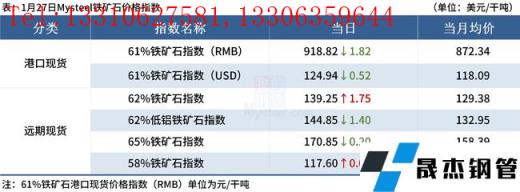 ◎ 1月27日統(tǒng)計新口徑114家無縫鋼管廠家進口燒結(jié)粉總庫存3792.52萬噸,燒結(jié)粉總?cè)蘸?8.14萬噸。原口徑64家無縫鋼管廠家進口燒結(jié)粉總庫存1754.93萬噸,燒結(jié)粉總?cè)蘸?7.99萬噸,庫存消費比36.57,燒結(jié)礦中平均使用進口礦配比88.07%,無縫鋼管廠家不含稅平均鐵水成本3139元/噸。