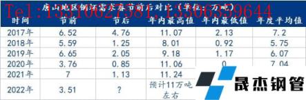 2021年鋼坯價格全年價格雖處于近三年高位水平,但因原燃料價格的持續攀高,唐山普方坯調研毛利均寬幅調整,均值約為380元/噸。而12月份以來價格剛剛扭虧為盈,無縫厚壁鋼管廠家仍存挺價情緒。另外由于環保限產30-50%帶來的實際成本上升120元/噸左右。據統計:截至1月27日,唐山地區主流樣本無縫厚壁鋼管廠家平均鐵水不含稅成本為3230元/噸,平均鋼坯含稅成本4261元/噸,周環比上調54元/噸,與目前普方坯出廠價格4500元/噸相比,無縫厚壁鋼管廠家平均毛利潤239元/噸。鋼坯利潤低位,無縫厚壁鋼管廠家挺價意愿較強,且節后原燃料市場預期向好,鋼坯成本端存在有力支撐。