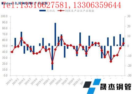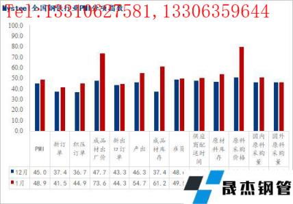 1月份,全國鋼鐵行業無縫厚壁鋼管廠家產出指數較12月份回升8.4個百分點,終值54.7。具體來看,進入1月份,各地對長流程無縫厚壁鋼管廠家限產政策明顯放松,各地高爐陸續復產,粗鋼產量明顯回升。至后半月,隨著春節假期臨近,短流程無縫厚壁鋼管廠家陸續放假,無縫厚壁鋼管廠家產量小幅回落。整體而言,1月份國內鋼鐵產出明顯回升。