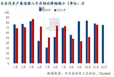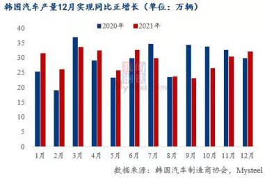 2021年11月日本汽車產(chǎn)量76萬輛,環(huán)比增長47%,截至2021年11月,日本汽車產(chǎn)量同比降幅連續(xù)三個月收窄;韓國2021年12月汽車產(chǎn)量32萬輛,環(huán)比增長5%,同比增長7%,是近四個月首次實現(xiàn)同比增長。
