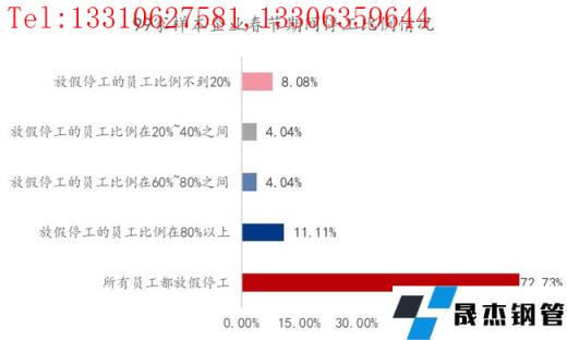 從圖5上看,放假停工的員工比例不到20%的占比為8.08%;放假停工的員工比例在20%-60%的占比為4.04%;放假停工的員工比例在60%-80%的占比為4.04%;放假停工的員工比例在80%以上的占比為11.11%;所有員工都放假停工的占比為72.73%。