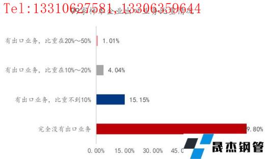 從圖23上看,完全沒有出口業(yè)務(wù)的企業(yè)占比為79.80%;有出口業(yè)務(wù)比重不到10%的企業(yè)占比為15.15%;有出口業(yè)務(wù)比重在10%-20%的企業(yè)占比為4.04%;有出口業(yè)務(wù)比重在20%-50%的企業(yè)占比為1.01%。