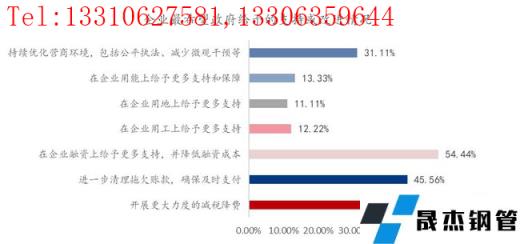 8、對于2022年發(fā)展前景預(yù)期偏謹慎。本次調(diào)研樣本企業(yè)中對2022年發(fā)展前景預(yù)期持樂觀或比較以及非常樂觀的企業(yè)占比57.58%,不太樂觀或比較悲觀的企業(yè)占比為33.33%,因此對于未來一段時間的投入情況,持適當或大規(guī)模增加的企業(yè)占比為46.46%,暫不增加投入的占比為43.43%,適當縮減或退出部分業(yè)務(wù)的企業(yè)占比為10.10%,由此看來,目前整體經(jīng)濟環(huán)境的確面臨一定壓力,導(dǎo)致企業(yè)信心相對保守,而主要原因是經(jīng)濟下行壓力下,穩(wěn)增長政策力度不夠。企業(yè)希望得到政府的支持與改進的呼聲最大的是開展更大力度的減稅降費以及降低融資成本,進一步清理拖欠賬款,確保及時支付,持續(xù)優(yōu)化營商環(huán)境,公平執(zhí)法、減少微觀干預(yù)。