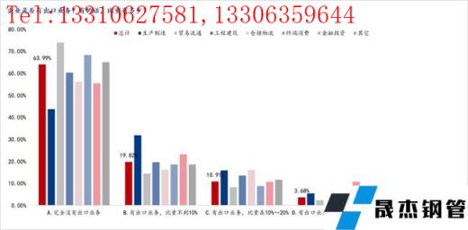 本地調(diào)研,我們還就企業(yè)是否有出口業(yè)務、出口業(yè)務比重有進行了調(diào)研。 調(diào)研顯示,完全沒有出口業(yè)務的企業(yè)占比63.99%,有出口業(yè)務,比重不到10%的企業(yè)占比19.82%,有出口業(yè)務,比重在10%~20%的企業(yè)占比10.91%,有出口業(yè)務,比重在20%~50%的企業(yè)占比3.68%,有出口業(yè)務,比重在50%以上的占比只有1.60%。分行業(yè)來看,幾乎所有行業(yè)出口占比都比較低,其中生產(chǎn)企業(yè)整體要高于其他行業(yè)。