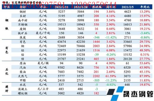 免責聲明:本網站(山東聊城晟杰無縫鋼管廠m.vsocial.cn)刊載的“周報:大宗原材料價格周報(2.07-2.11)”等均源于網絡,版權歸原作者所有,且僅代表原作者觀點,本文所載信息僅供參考。轉載僅為學習與交流之目的,如無意中侵犯您的合法權益,請及時聯系刪除。本網站刊登此篇文章并不意味著本站贊同其觀點或證實其內容的真實性,我們不對其科學性、嚴肅性等作任何形式的保證。如果侵犯了您的版權,請盡快聯系我們予以撤銷,謝謝合作!