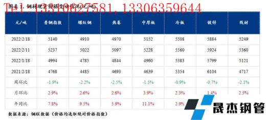 本周普鋼價格指數(shù)小幅下跌。截至2月18日,普鋼價格指數(shù)報5140點,環(huán)比跌1.9%;螺紋鋼報4910元/噸,環(huán)比上周跌2.2%元/噸。本周厚壁無縫鋼管價格結(jié)束上漲出現(xiàn)回落,原因在于驅(qū)動價格上漲的邏輯出現(xiàn)變化。