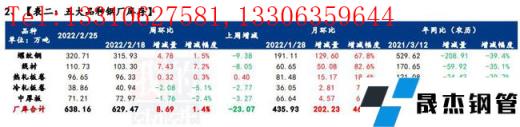 據(jù)統(tǒng)計(jì),建材方面,分品種來看,螺線供庫(kù)雙增;分域來看,除東北和華北少量減產(chǎn),其余區(qū)域均有增量;從省份來看,河南、四川、廣東、廣西、江蘇和浙江增量明顯,主因在于設(shè)備復(fù)產(chǎn);從工藝角度來看,本周增產(chǎn)貢獻(xiàn)率主要在短流程生產(chǎn)企業(yè)。熱卷方面,本周熱軋產(chǎn)量大幅回升,主要增幅地區(qū)是華北地區(qū),主要是冬奧會(huì)限產(chǎn)結(jié)束,部分無縫厚壁鋼管廠家軋機(jī)及高爐復(fù)產(chǎn),導(dǎo)致產(chǎn)量增加,主要降幅地區(qū)是華中地區(qū),主要是新增無縫厚壁鋼管廠家檢修,導(dǎo)致供給有所下降。