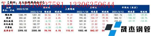 庫(kù)存方面,五大品種厚壁無縫鋼管總庫(kù)存春節(jié)后連續(xù)累增四周,環(huán)比上周增加94.94萬(wàn)噸,增幅4.1%。分品種看,建材庫(kù)存增加105.78萬(wàn)噸,增幅為6.9%;板材庫(kù)存減少10.84萬(wàn)噸,降幅1.4%;分指標(biāo)看,無縫厚壁鋼管廠家?guī)齑姝h(huán)比增加8.69萬(wàn)噸,增幅1.4%;社會(huì)庫(kù)存環(huán)比增加86.25萬(wàn)噸,增幅5.2%。