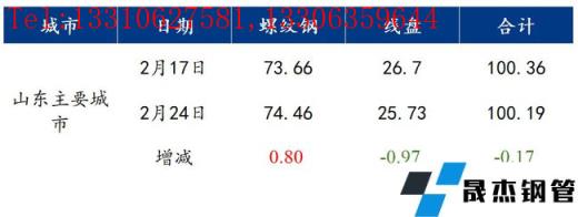 本周山東13個(gè)主要城市建筑厚壁無縫鋼管總庫存100.19萬噸,較上周降低0.17萬噸,較去年同期降低48.04萬噸。其中,螺紋鋼74.46萬噸,較上周增加0.8萬噸,盤螺25.73萬噸,較上周降低0.97萬噸。