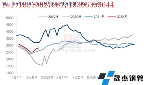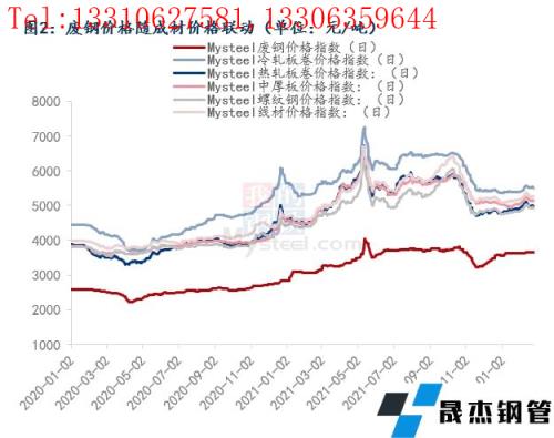 由于廢鋼的定價權基本掌握在無縫厚壁鋼管廠家手中,其價格彈性往往大于成材,如果行情不好導致成材價格出現下跌,那么無縫厚壁鋼管廠家就會降低自身的廢鋼消耗量,下調廢鋼價格,所以廢鋼價格可以看成是隨著成材價格走勢而變化,處于相對被動的位置。由圖2可以看出,從近三年的價格走勢可以看出,廢鋼價格與五大材的價格走勢關聯性很高。今年1月以來截止當前廢鋼的漲幅為2.49%,五大材的漲幅也均在2%-3%之間,所以今年1月份以來成材價格上漲也支撐了廢鋼價格的上漲。