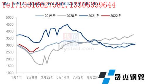 為什么廢鋼資源會存在階段性偏緊?其實在第一部分中已經討論過,廢鋼資源近幾年內都是在每年的1月到節后的一段時間內存在著供需缺口,主要是因為廢鋼加工基地節前會放假,節后復工較晚導致的市場資源偏緊,無縫厚壁鋼管廠家因此在這段時間內收廢較為困難,今年也不例外。但今年1月份61家無縫厚壁鋼管廠家的到貨量同比去年有所降低(圖4所示),到貨量同比有所降低,分析下來大概有三方面原因:一是由于產廢的制造業企業放假較早、房地產行業的走弱,使得社會加工廢鋼減少,外加疫情阻礙了廢鋼資源的流通,導致了廢鋼加工基地收廢困難。今年1月293家樣本基地庫存同比降低有30萬噸左右(圖5所示);二是今年1月以來五大材的總產量低于去年同期(圖6所示);三是電爐廠自今年1月以來普遍處于虧損的狀態,利潤情況要遠差于去年同期(圖7所示)。后面兩方面原因導致了無縫厚壁鋼管廠家降低了廢鋼消耗量,所以今年1月以來61家樣本無縫厚壁鋼管廠家的廢鋼日耗同比低于去年(圖8所示),需求端的走弱聯動了供應端一起走弱。所以以上三方面原因綜合導致了今年1月份來無縫厚壁鋼管廠家收廢量不及去年同期。