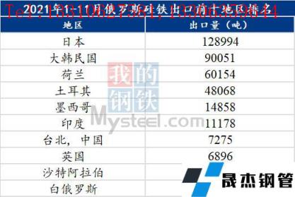 2021年1-11月,俄羅斯硅鐵合計出口39萬噸,其中出口至日本12.899萬噸,韓國9萬噸,印度1.12萬噸,占據總出口量約59%.。據俄羅斯相關企業透露,2021年俄羅斯硅鐵產量56.48萬噸,出口量42.54萬噸。