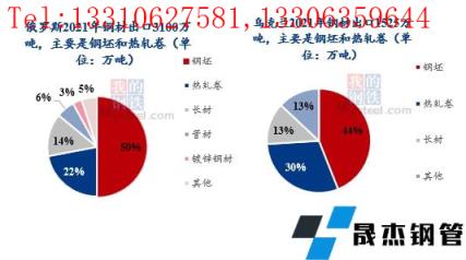 俄、烏均是產(chǎn)鋼大國和厚壁無縫鋼管主要出口國,兩國主要出口產(chǎn)品均為鋼坯、熱軋卷、長材。據(jù)世界鋼協(xié)統(tǒng)計(jì),2021年,俄、烏粗鋼產(chǎn)量分別為7600萬噸和2140萬噸,產(chǎn)量在全球排名第五和第十四位,分別占全球粗鋼總產(chǎn)量的3.9%和1.1%。