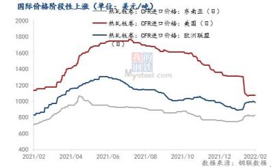 國際鋼價(jià)自俄烏沖突以來迎來了階段性上漲,截至2月28日,歐盟及東南亞進(jìn)口CFR價(jià)格月環(huán)比分別上漲100美元/噸和82美元/噸,另外美國進(jìn)口價(jià)格也在2月中下旬停止了下跌趨勢開始企穩(wěn)。