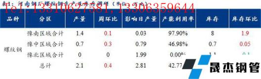 1、調(diào)研數(shù)據(jù)顯示,統(tǒng)計(jì)的河南地區(qū)10家建筑厚壁無(wú)縫鋼管樣本無(wú)縫厚壁鋼管廠家中,河南省建材無(wú)縫厚壁鋼管廠家螺紋鋼日產(chǎn)量2.1萬(wàn)噸;檢修/限產(chǎn)影響建材日產(chǎn)量為2.81萬(wàn)噸,產(chǎn)能利用率為42.77%,較上周上升8.15%。