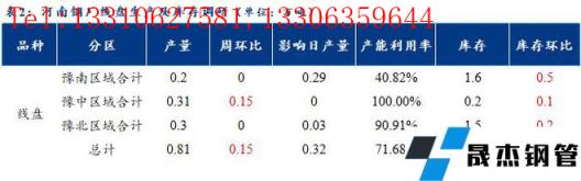 1、調(diào)研數(shù)據(jù)顯示,統(tǒng)計(jì)的河南地區(qū)10家建筑厚壁無(wú)縫鋼管樣本無(wú)縫厚壁鋼管廠家中,河南省無(wú)縫厚壁鋼管廠家線盤(pán)日均產(chǎn)量0.81萬(wàn)噸,較上周小幅增加0.15萬(wàn)噸;檢修/限產(chǎn)影響建材日產(chǎn)量為0.32萬(wàn)噸,產(chǎn)能利用率71.68%,較上周上升13.27%。