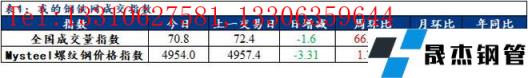 訊:全國建筑厚壁無縫鋼管成交量監(jiān)測,成交量相對指數(shù)來看,全國70.8減1.6,北方34.5減3.4,華東104.9減4.5,南方56.7增2.2。今日螺紋鋼價(jià)格指數(shù)4954,較上一交易日減3.31。