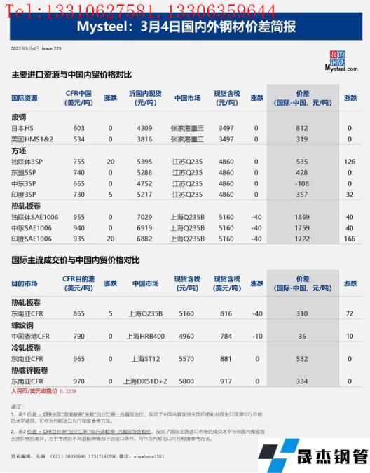 免責聲明:本網站(山東聊城晟杰無縫鋼管廠m.vsocial.cn)刊載的“2022年03月04日日報:國內外鋼材_無縫鋼管價差匯總(2022.3.4)”等均源于網絡,版權歸原作者所有,且僅代表原作者觀點,本文所載信息僅供參考。轉載僅為學習與交流之目的,如無意中侵犯您的合法權益,請及時聯系刪除。本網站刊登此篇文章并不意味著本站贊同其觀點或證實其內容的真實性,我們不對其科學性、嚴肅性等作任何形式的保證。如果侵犯了您的版權,請盡快聯系我們予以撤銷,謝謝合作!