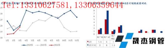 3月無(wú)縫厚壁鋼管廠(chǎng)家對(duì)京津冀區(qū)域投放量環(huán)比增加41.3萬(wàn)噸,同比增加13.15萬(wàn)噸。進(jìn)入3月份,京津冀無(wú)縫厚壁鋼管廠(chǎng)家復(fù)產(chǎn)加速,整體投放量明顯上升。到貨方面以火運(yùn)為主,受公共衛(wèi)生事件影響,火運(yùn)到貨不穩(wěn)定,具體來(lái)看:1、河鋼承鋼兩螺一線(xiàn)在產(chǎn),對(duì)京津冀投放量2月份19.5萬(wàn)噸,2月份增加至26.5萬(wàn)噸;2、河鋼樂(lè)鋼一條螺紋產(chǎn)線(xiàn)在產(chǎn),計(jì)劃本月再?gòu)?fù)產(chǎn)一條,對(duì)京津冀投放增加,2月份整體9萬(wàn)噸,3月份計(jì)劃增加至14.5萬(wàn)噸;3、敬業(yè)無(wú)縫厚壁鋼管廠(chǎng)家4條螺紋產(chǎn)線(xiàn)在產(chǎn),加上烏鋼資源流入,對(duì)京津冀投放量環(huán)比增加19萬(wàn)噸;4、本月中旬,東華無(wú)縫厚壁鋼管廠(chǎng)家螺紋產(chǎn)線(xiàn)計(jì)劃復(fù)產(chǎn);5、鑫達(dá)一條螺紋產(chǎn)線(xiàn)不飽和生產(chǎn),2月京津冀僅投放5萬(wàn),3月份計(jì)劃投放9萬(wàn)噸;5、東北西北材新?lián)徜摗⒑v巍⑽髁郑?月份對(duì)北京市場(chǎng)合計(jì)投放5.3萬(wàn)噸左右,2月份計(jì)劃5.5萬(wàn)噸。