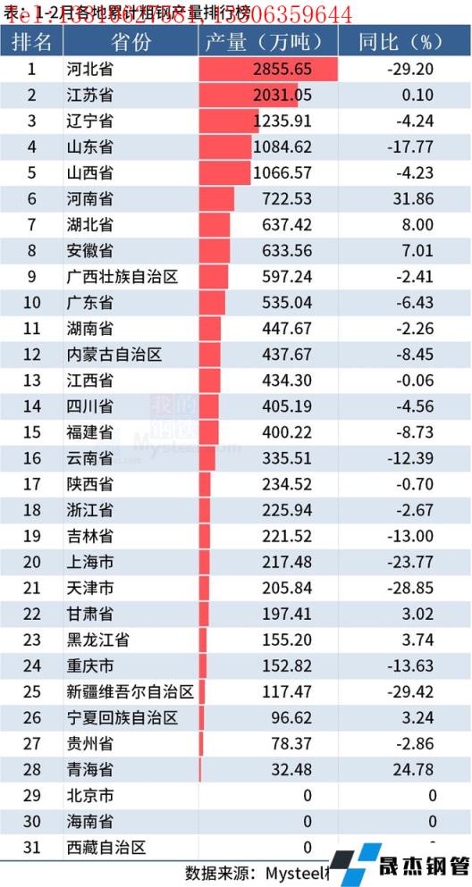 從分省數(shù)據(jù)來看,有4個(gè)省份1-2月粗鋼產(chǎn)量同比降幅超過20%。其中河北降29.20%、上海降23.77%,天津降28.85%和新疆降29.42%。具體情況如下: