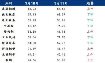 具體各品種指數來看,3月18日建筑厚壁無縫鋼管情緒指數為65.03,較3月11日回升10.41;熱軋板卷情緒指數為59.13,較3月11日回落4.26;冷軋板卷情緒指數為57.73,較3月11日回落1.18;中厚板情緒指數為67.42,較3月11日回落8.78;結構鋼情緒指數為53.88,較3月11日回升11.9;工業線材情緒指數為54.66,較3月11日回落17.04;鍍鋅板卷情緒指數為54.88,較3月11日回落4.84;焊接厚壁鋼管情緒指數為71.19,較3月11日回升29.72;無縫厚壁鋼管情緒指數為64.21,較3月11日回升19.05;帶鋼情緒指數為69.66,較3月11日回升14.46。