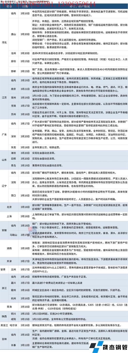 截至3月21日,匯總了16個省份停工停產(chǎn)最新信息。其中,3月21日,南京全市范圍內(nèi)除保障市民生活和城市基本運行的水、電、燃油、燃氣、通訊、環(huán)衛(wèi)、糧油肉菜供應(yīng)等公共服務(wù)類企事業(yè)單位外,其他有條件的單位盡可能安排居家辦公。3 月20日,唐山開平區(qū)、豐南區(qū)、灤州市、遷西縣全域?qū)嵤﹪栏穹饪毓芾?;大部分鋼企維持生產(chǎn),但政府實施道路管控,無縫厚壁鋼管廠家均面臨運輸方面的問題。深圳全市福田、羅湖、南山、寶安、龍崗以及龍華暫未恢復(fù),全市封控區(qū)、管控區(qū)、防范區(qū)繼續(xù)嚴格執(zhí)行疫情防控相關(guān)措施。山東濰坊日照、青島萊西市實現(xiàn)社會面動態(tài)清零。河北滄州連續(xù)4天實現(xiàn)社會面動態(tài)清零,3月20日起部分地區(qū)逐步解除封控。具體情況如下: