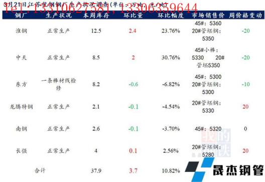 江蘇優(yōu)特?zé)o縫厚壁鋼管廠家棒材總庫(kù)存37.9萬(wàn)噸,較上周上升3.7萬(wàn)噸,環(huán)比增10.82%,較去年同期下降5.56萬(wàn)噸,同比降12.79%,目前江蘇優(yōu)特?zé)o縫厚壁鋼管廠家除東方特鋼一條棒材線檢修外,其余無(wú)縫厚壁鋼管廠家正常生產(chǎn)。