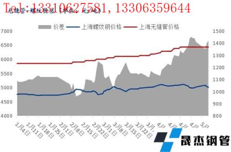 今年以來,國內(nèi)無縫管價格不斷走高,在近幾個月中的階段性調(diào)整中始終保持堅挺運行。以上海市場價格為例,截止5月7號上海市場108*4.5mm主流無縫管價格為6430元/噸,2月、4月出現(xiàn)兩波明顯的上漲行情,進入5月價格開啟震蕩調(diào)整行情。通過對比上海地區(qū)無縫管與螺紋價差,我們可以發(fā)現(xiàn)兩個品種間的價差處于擴張區(qū)間,108*4.5mm無縫管與20mm螺紋價差從年初的1090元/噸擴大到1420元/噸。那么,目前無縫管價格堅挺的主要原因有哪些?對于后期行情的參考點又在哪里?