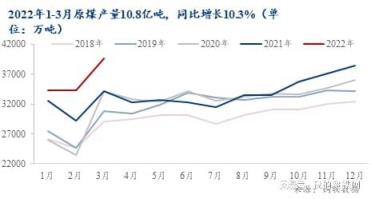 2022年1-3月全國(guó)原煤產(chǎn)量累計(jì)生產(chǎn)10.8億噸,同比增長(zhǎng)10.3%,其中3月份原煤產(chǎn)量3.96億噸,同比增長(zhǎng)14.8%。國(guó)家能源局3月發(fā)布《2022年能源工作指導(dǎo)意見(jiàn)》,提出將著力增強(qiáng)國(guó)內(nèi)能源生產(chǎn)保障能力,切實(shí)把能源飯碗牢牢地端在自己手里。