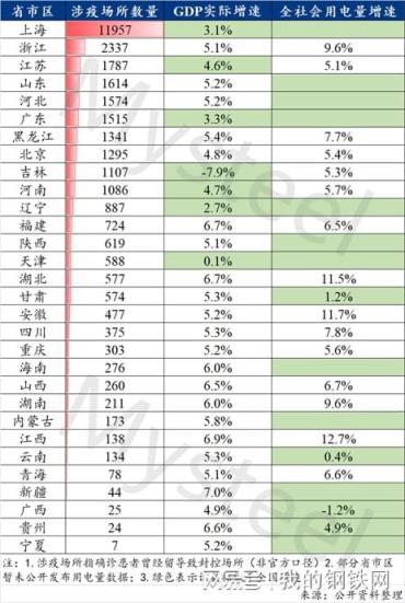 表1.截至5月7日全國(guó)省份涉疫場(chǎng)所數(shù)量與一季度GDP、用電量增速排名