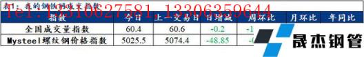 訊:全國建筑厚壁無縫鋼管成交量監測,成交量相對指數來看,全國60.4增0.2,北方41減1.9,華東86.9增0.9,南方45.5減0.3。今日螺紋鋼價格指數5025.5,較上一交易日減48.85。