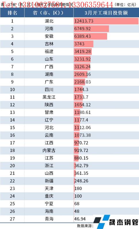 資料顯示,湖北省是此次唯一超萬億元的省份,開工總投資約為12414億元,排名第一。其次是河南、安徽,總投資額分別為6750億元、6389億元。