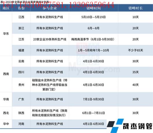 其中,貴州省水泥工業協會在延長2022年二季度錯峰生產停窯的通知中表示,由于原燃材料價格大幅上漲、下游需求持續低迷、企業庫存持續高位,二季度每條生產線在錯峰生產停窯40天基礎上再增加5天錯峰生產停窯時間。全國水泥企業夏季錯峰計劃具體情況如下: