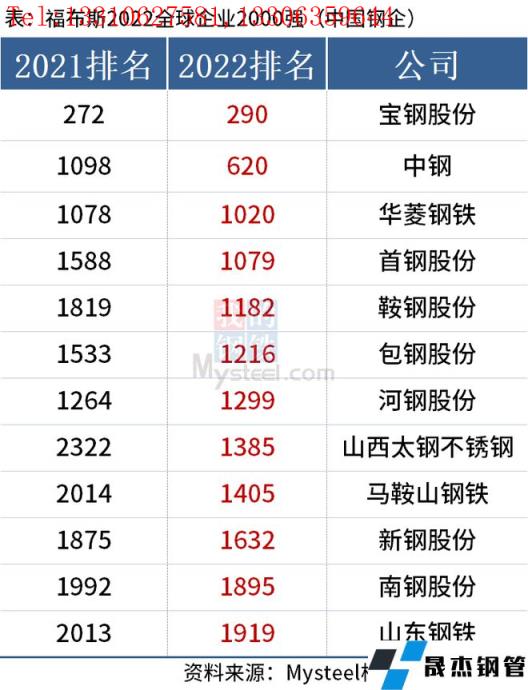 免責聲明:本網站(山東聊城晟杰無縫鋼管廠m.vsocial.cn)刊載的“中國12家鋼企上榜福布斯2022全球企業2000強”等均源于網絡,版權歸原作者所有,且僅代表原作者觀點,本文所載信息僅供參考。轉載僅為學習與交流之目的,如無意中侵犯您的合法權益,請及時聯系刪除。本網站刊登此篇文章并不意味著本站贊同其觀點或證實其內容的真實性,我們不對其科學性、嚴肅性等作任何形式的保證。如果侵犯了您的版權,請盡快聯系我們予以撤銷,謝謝合作!