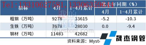 1-4月,中國(guó)粗鋼產(chǎn)量33615萬噸,同比下降10.3%;生鐵產(chǎn)量28030萬噸,同比下降9.4%;厚壁無縫鋼管產(chǎn)量42682萬噸,同比下降5.9%。