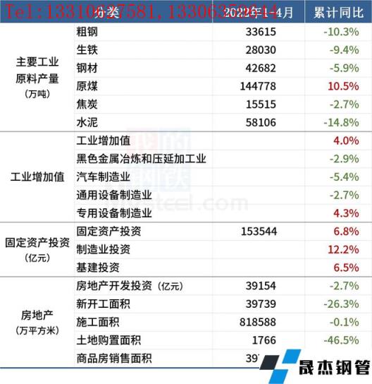 1-4月份,全國規(guī)模以上工業(yè)增加值同比增長4.0%,比1-3月份回落2.5個百分點。4月全國粗鋼日均產(chǎn)量309.27萬噸,環(huán)比增長8.6%。