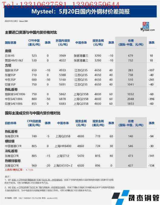 免責聲明:本網站(山東聊城晟杰無縫鋼管廠m.vsocial.cn)刊載的“2022年05月20日日報:國內外鋼材_無縫鋼管價差匯總(2022.5.20)”等均源于網絡,版權歸原作者所有,且僅代表原作者觀點,本文所載信息僅供參考。轉載僅為學習與交流之目的,如無意中侵犯您的合法權益,請及時聯系刪除。本網站刊登此篇文章并不意味著本站贊同其觀點或證實其內容的真實性,我們不對其科學性、嚴肅性等作任何形式的保證。如果侵犯了您的版權,請盡快聯系我們予以撤銷,謝謝合作!
