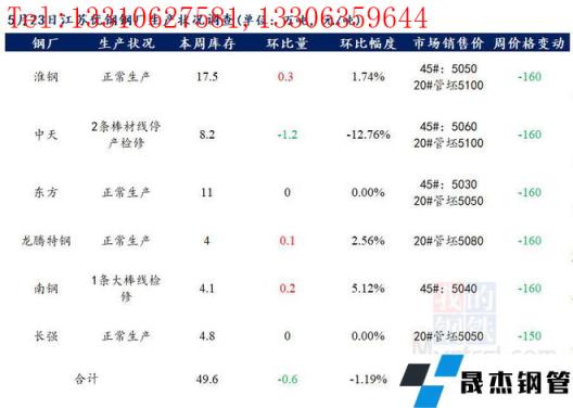 江蘇優特無縫厚壁鋼管廠家棒材總庫存49.6萬噸,較上周減少0.6萬噸,環比降1.19%,較去年同期增加13.38萬噸,同比增36.94%,目前省內南鋼一條大棒線檢修,中天2條棒材線檢修,其余無縫厚壁鋼管廠家正常生產。