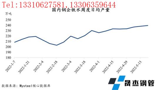 截止到5月20日, 247家鋼鐵企業樣本日均鐵水產量由4月初的226.1萬噸上漲13萬噸,漲幅約為5.7%。