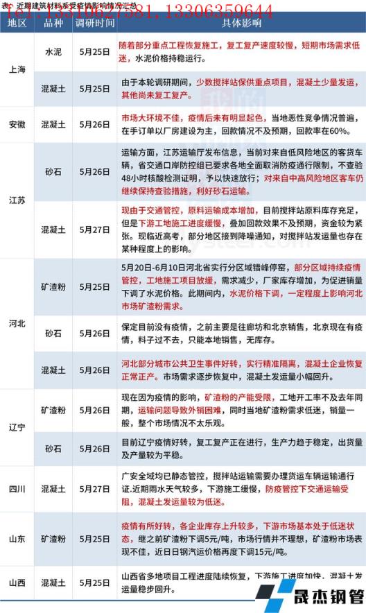 截至5月27日,據(jù)百年建筑網(wǎng)調(diào)研,8個省份建材市場受到了不同程度的影響。進(jìn)入五月下旬后,施工整體進(jìn)度尚未進(jìn)入“減速”階段,今年整體施工進(jìn)度提升緩慢,市場需求降幅拐點未來臨。目前疫情防控形勢繼續(xù)好轉(zhuǎn),建筑材料發(fā)運(yùn)量有一定上升空間。現(xiàn)華東地區(qū)疫情雖得到了一定的控制,但由于交通管控因素,材料運(yùn)輸仍存在一定壓力。具體情況如下: